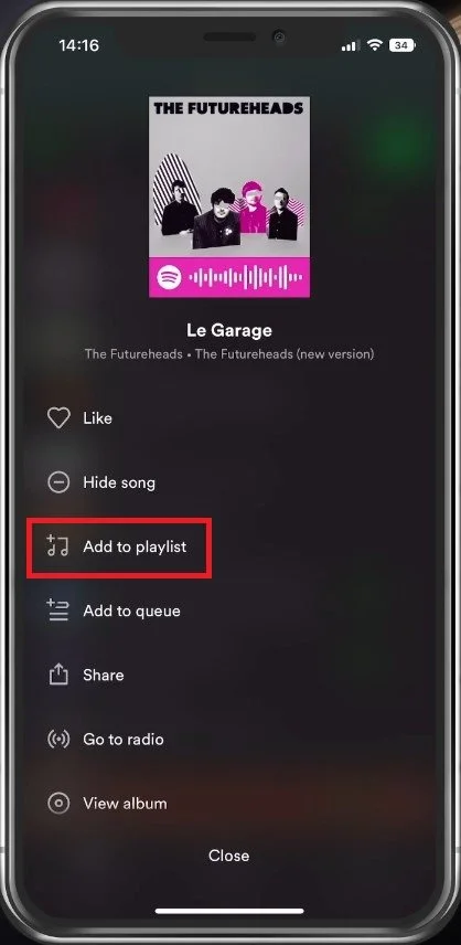 Tap on the three dots or the burger menu icon for the song and select Add to playlist. You can add the music to one of the playlists you created.