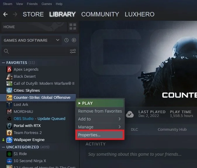 The corrupt disk error can occur for various reasons, including problems with your hard drive, software conflicts, or issues with the Steam client. First, open up your Steam launcher and navigate to your game library. Proceed to right-click the Steam game in your library and select Properties.