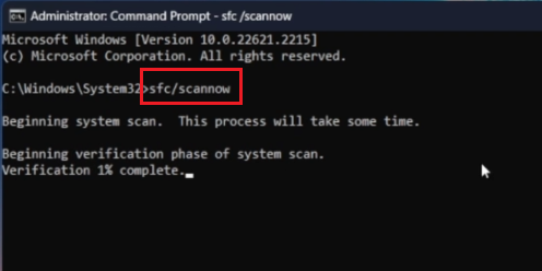 In the command line, type "sfc /scannow" and press enter to initiate a scan that identifies and repairs any corrupted Windows files, restoring them to a pristine state.