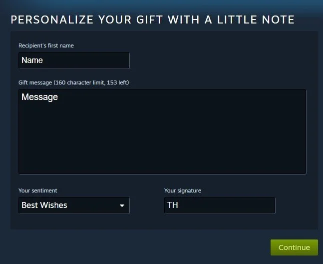 Enter the recipient's name and enter a gift message. You can write whatever you want here; your friend only sees it after sending it. Lastly, enter a sentiment and your signature, so the user knows you sent the game. After clicking on Continue, you will have to enter your payment details or use your Steam wallet funds, and you can then review your purchase, and you’re done.