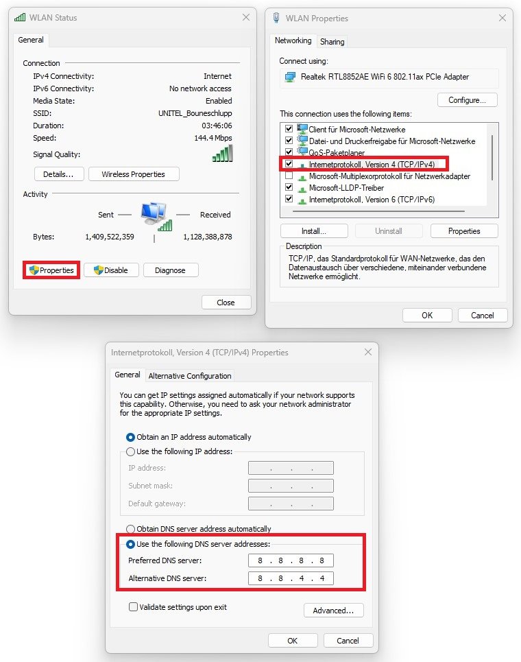 Select Properties, and finally, double-click the Internet Protocol Version 4. This will allow you to change your DNS server addresses. Select to use the following DNS server addresses, and for your Preferred DNS server, use: 8 8 8 8, and for your alternative DNS server, use: 8 8 4 4.