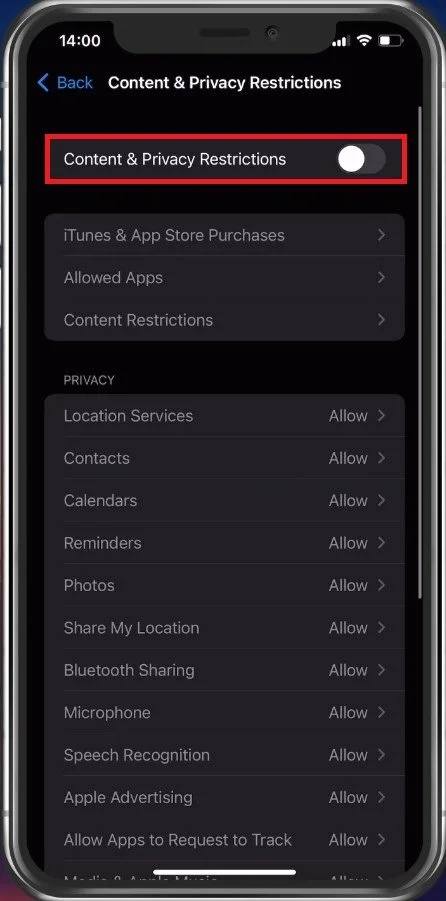 iPhone Settings > Screen Time > Content & Privacy Restrictions