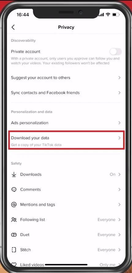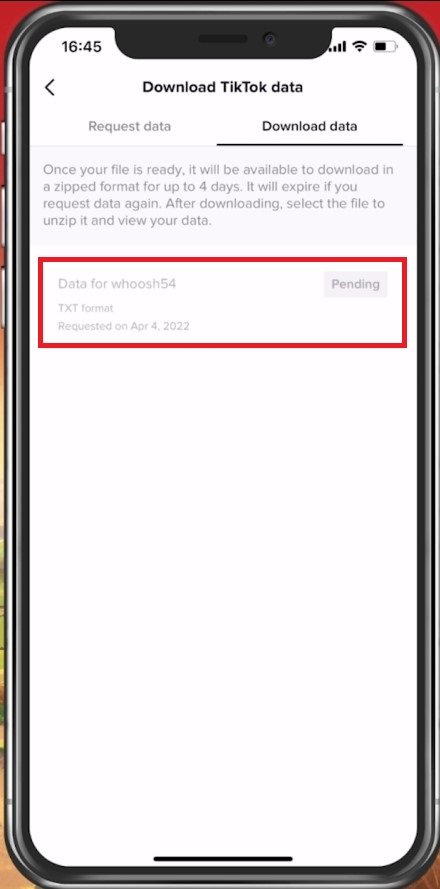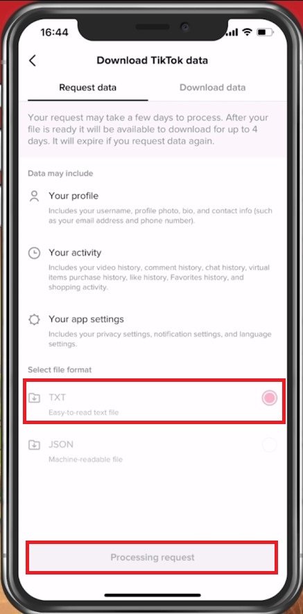 When requesting your TikTok data, all of your recent activity will be sent to you, but it may take up to a day in order to get all the information you need. Make sure to select TXT as the file format, which will be in normal text format. Next, tap on Request Data.
