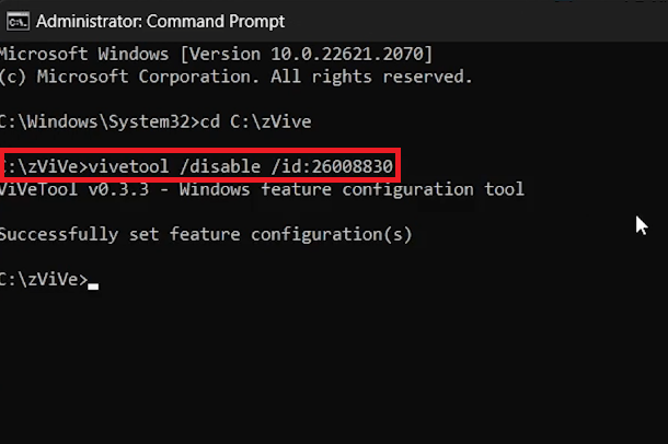 vivetool /disable /id:26008830and hit Enter.You'll see a message confirming that the changes were successfully implemented.