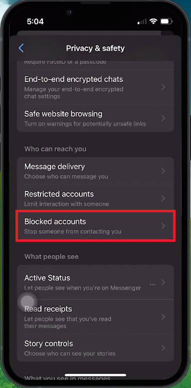 To view your blocked contacts, open the Messenger app, tap on your profile icon, go to 'Privacy and Safety,' and then select 'Blocked Accounts'. This will show you all the contacts you've blocked.