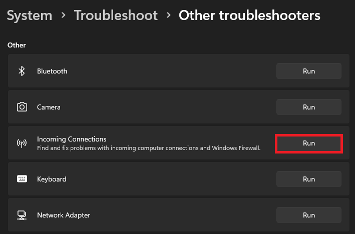 Navigate to Windows Settings, select 'System', then 'Troubleshoot'. Here you will find the option for 'Other Troubleshooters' where you can initiate the 'Incoming Connections' troubleshooter.