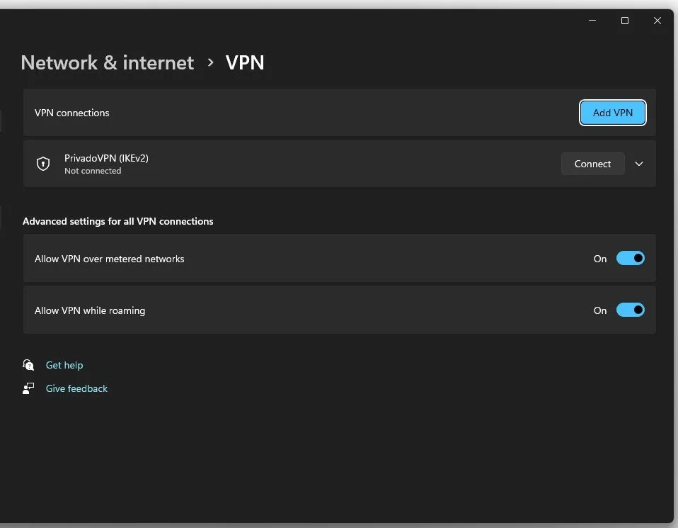 Windows Settings > Network & internet > VPN