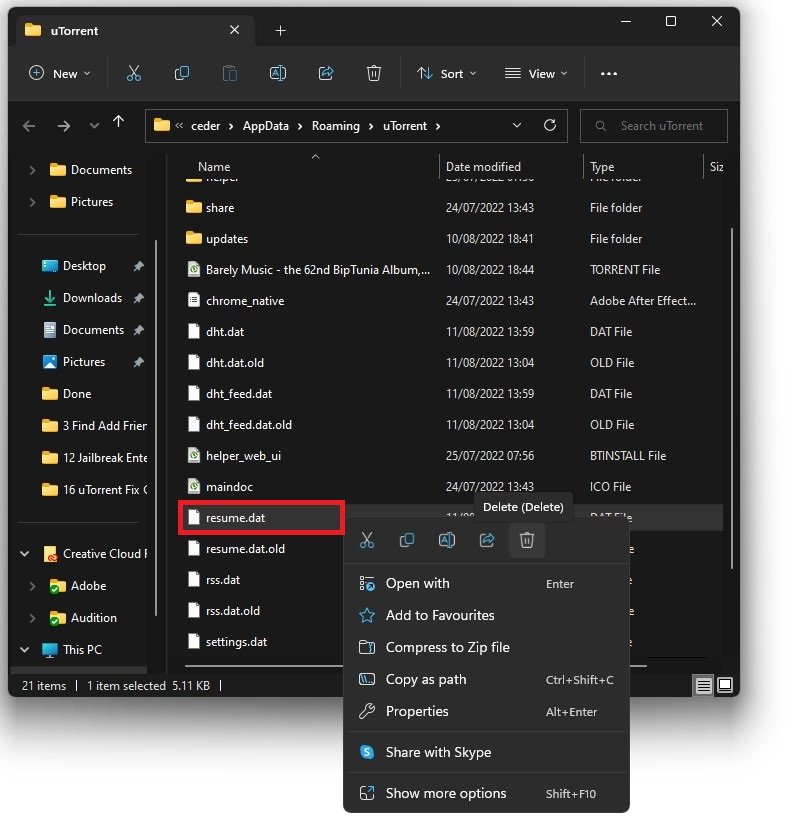 When this is done, search for %AppData% in your start menu search and hit enter. A new folder will open up. From here, navigate to uTorrent and delete the resume.DAT file. This will re-create the file once you re-open uTorrent, and it will, in many cases, fix the Connecting to Peers problem.