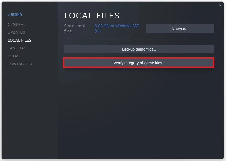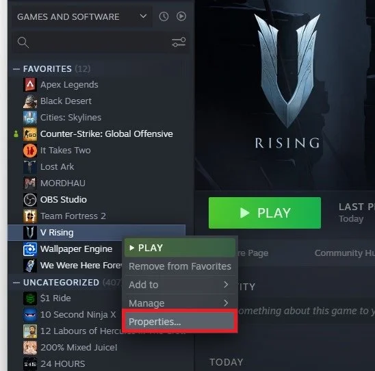 Ensure your game files are complete and up to date. Make sure that V Rising is not running in the background, and open up your Steam library. Here, right-click V Rising and select Properties.