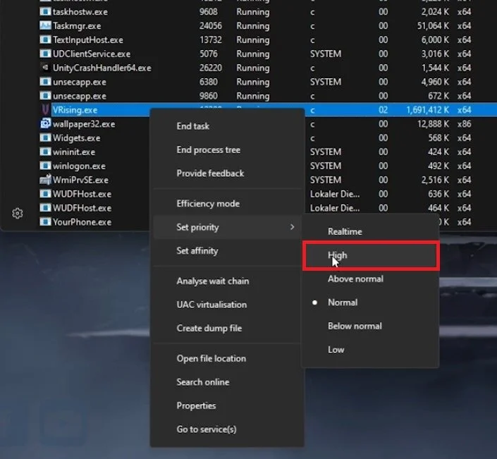 After applying your changes, leave the game running and open up your Task Manager. Right-click the V Rising process and select to go to Details. The primary game process should be highlighted in this list. Right-click the process and set its priority to high.