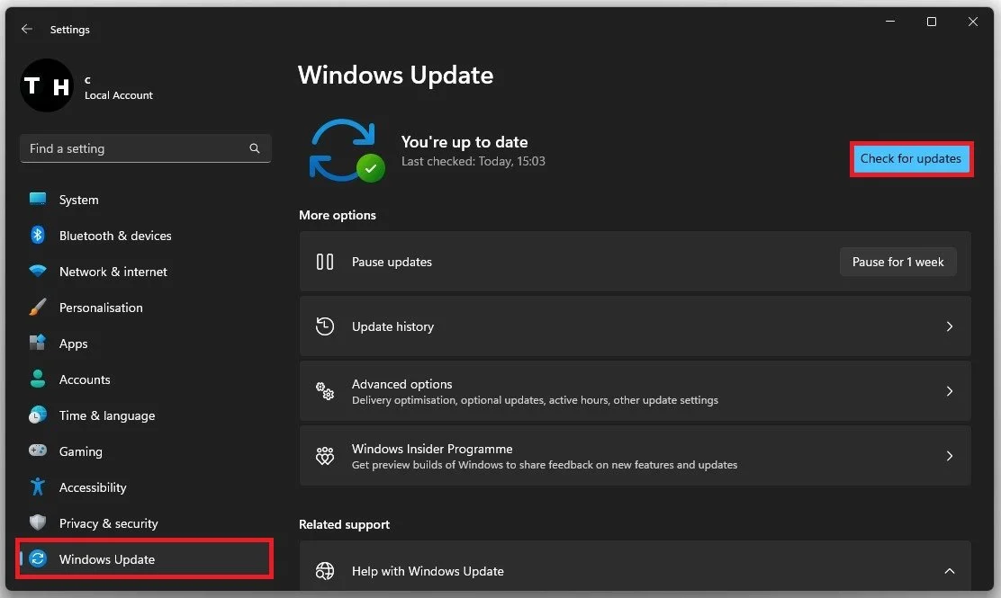 Keep your Settings window open and search for Update to get to your Windows Update settings. Make sure to check for recent updates, and if there is an update available to you, make sure to download it before restarting your PC, which will install the update for you.