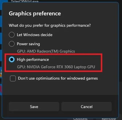 When selecting Options for the game, make sure to set the Graphics preference to High performance, which in most cases, will take advantage of your graphics processor to help run the game on your system.