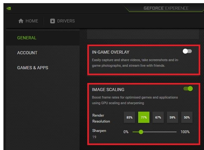 When navigating to your GeForce Settings, disable the In-Game Overlay in your General settings tab, as application overlays often cause performance issues.