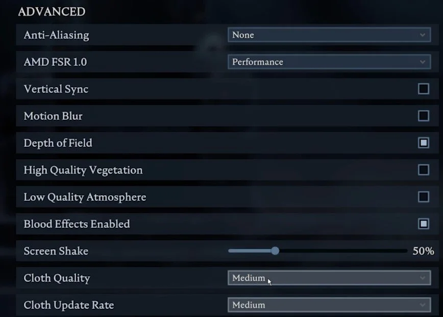 Leave Depth of Field enabled, disable High-Quality Vegetation and Low-Quality Atmosphere. Lastly, lower the Screen Shake option to 50%, and set the Cloth Quality and Cloth Update Rate to Medium. These two last settings can have a lot of impact on your graphics card performance. If you notice any lag, then lower the Cloth Quality setting to Low first.