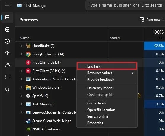 First, close all Valorant-related apps on your PC. Open up your Task Manager. In the Processes section, ensure all Valorant, Vanguard, and Riot Games processes are terminated.