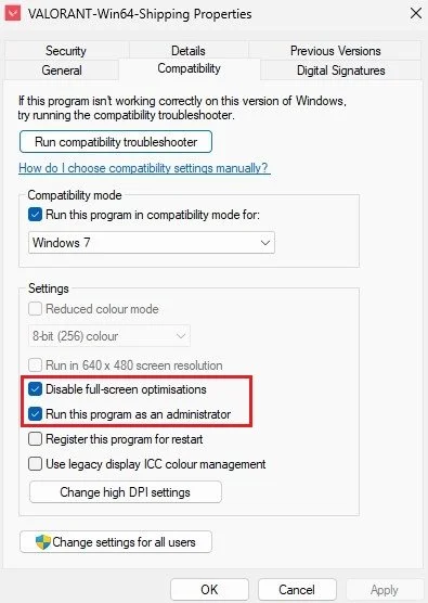 In the Compatibility section, disable full-screen optimizations and run the program as admin. Don’t forget to apply your changes.