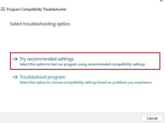 Next, right-click the Valorant application again and select Troubleshoot compatibility. The Program Compatibility Troubleshooter will launch. Select Try recommended settings, and you can then try to launch Valorant without getting the VAL 43 error.