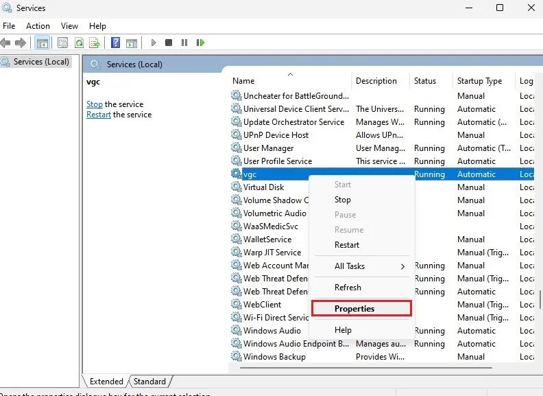 If the problem persists, then search for Services in your start menu search to open your Windows Services Manager. On this window, select any service and start typing VGC. Locate the Vanguard VGC service and right-click it to access the service properties.