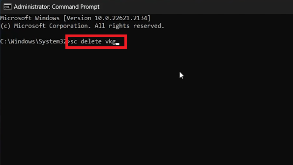Executing Commands: In the newly opened command window, it's time to input some specific commands to help resolve the issue. Start by typing “sc delete vgk” followed by the Enter key. This command helps in deleting potential problematic components.