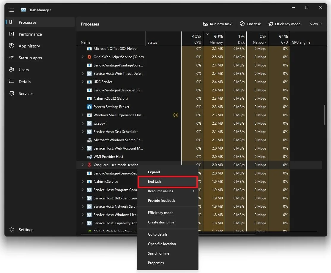 Close all Riot and Valorant processes which might still be running on your system. In your Task Manager, right-click each process in the Processes tab and select End Task.