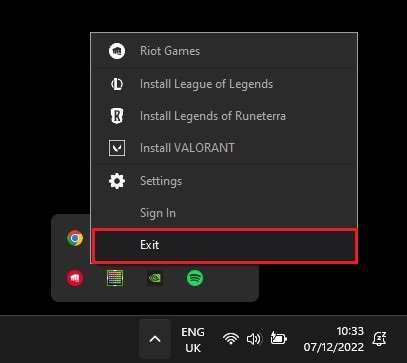 First, close all Valorant and Riot games processes running on your PC. Right-click the Riot Games icon in your system tray and select Exit.