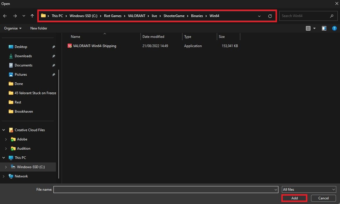 Navigate to the drive on which you install Riot Games. In this case, this will be the default C: drive > Riot Games > VALORANT > live > ShooterGame > Binaries > Win64. Select the Valorant-Win64-Shipping application and click on Add.