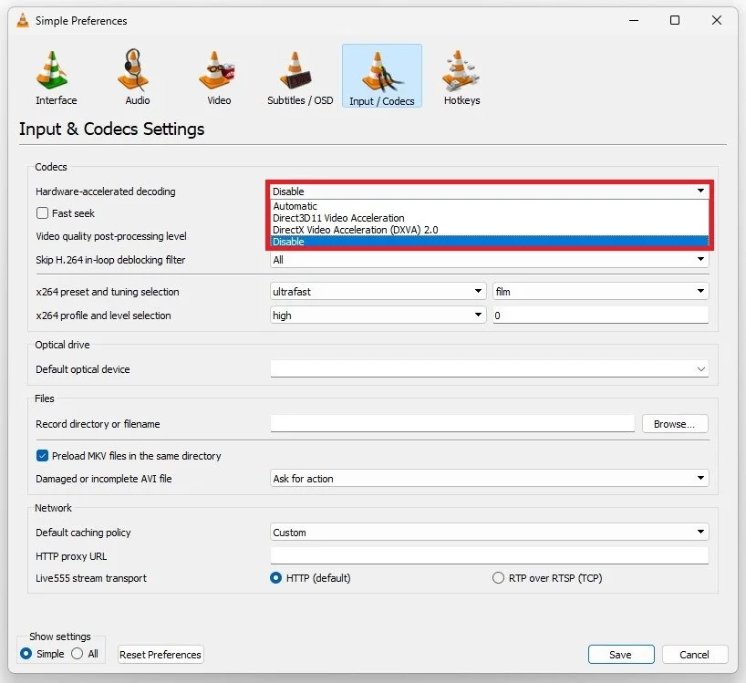 When this is done, you should toggle the Hardware-accelerated decoding option to see which one is helping you out the most. Switch to the simple settings and navigate to the Input / Codecs section. Here, switch the Hardware-accelerated decoding option from Automatic to Disable and save your changes. You can then play the video file again to see whether you should enable hardware acceleration. This will depend on whether your graphics card is a bottleneck to your performance.