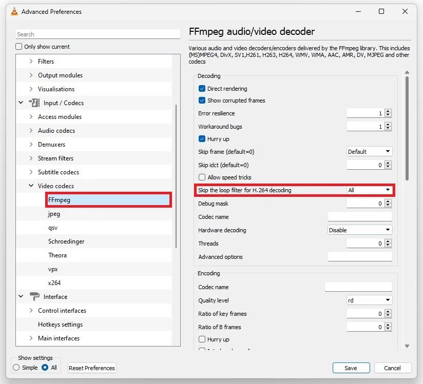 In the Input / Codecs section of your options, expand Video codecs and select FFmpeg. Set the Skip the loop filter for H.264 decoding option to All.
