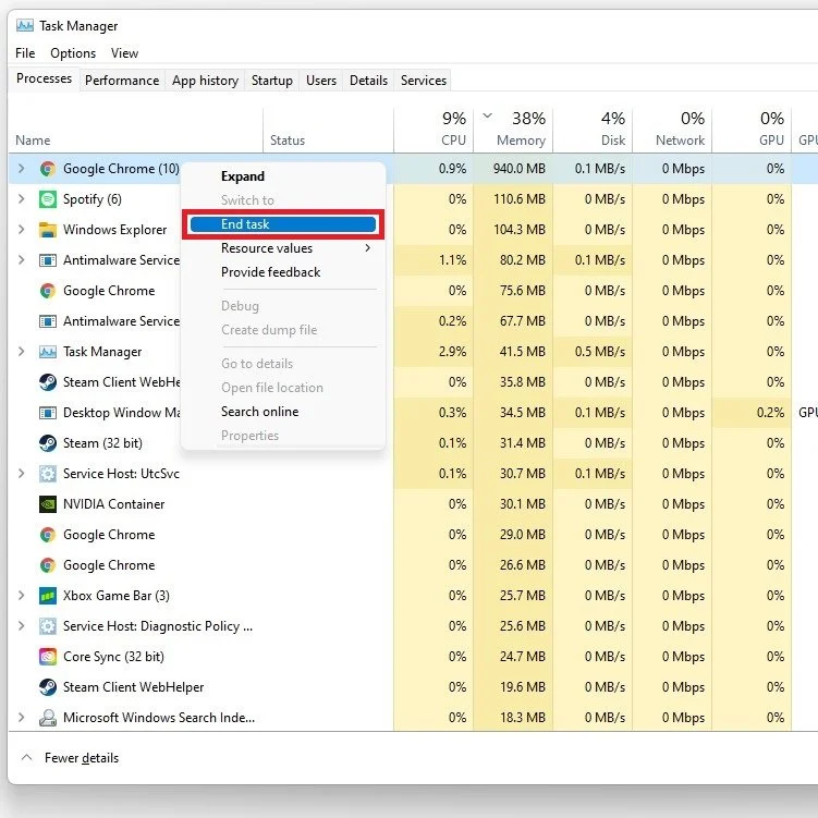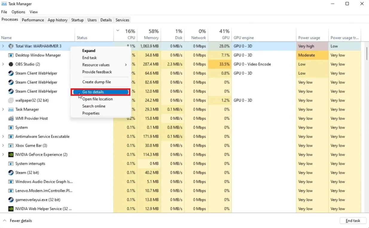 Leave the game running and open your Task Manager by searching for it in your Start Menu search. In the Processes tab, right-click the Warhammer 3 process and select to go to Details.