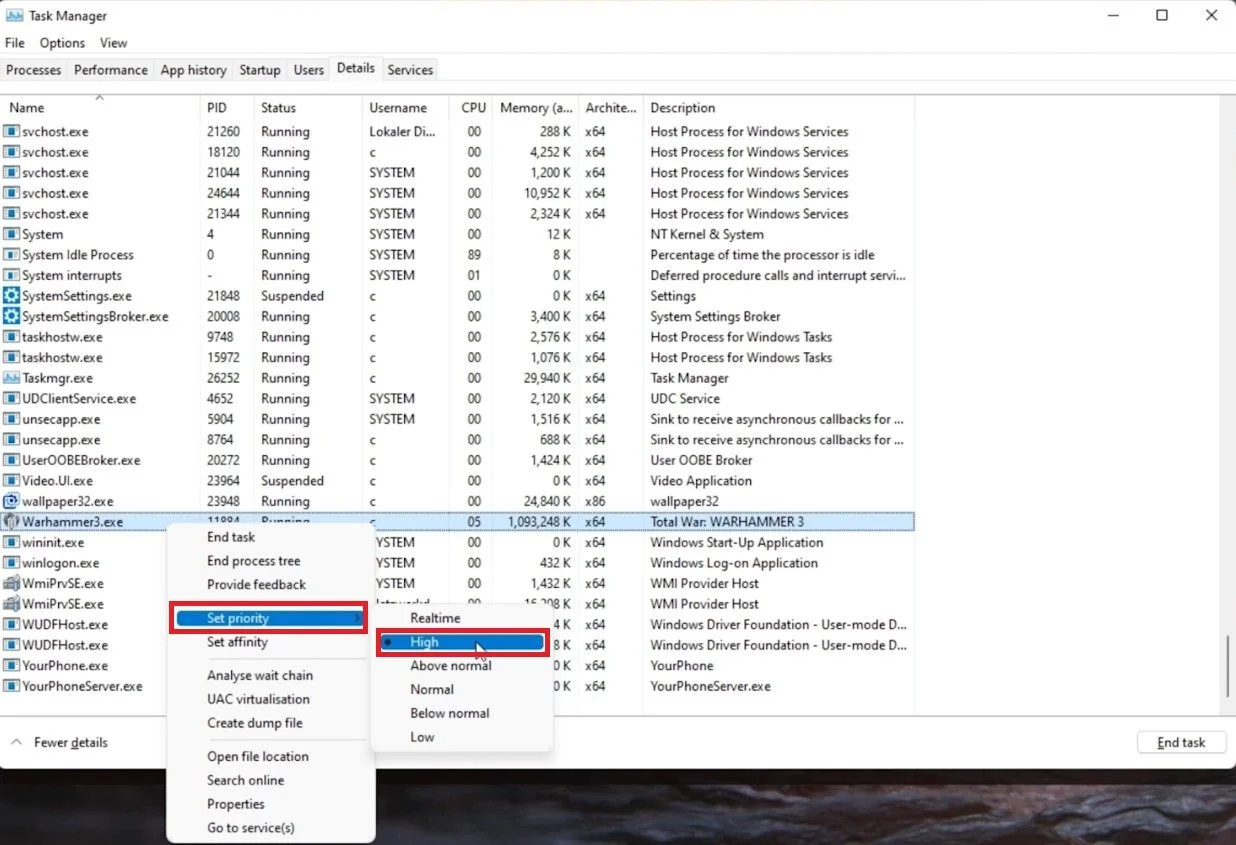 In the Details tab, right-click the highlighted process and set it’s priority to High.