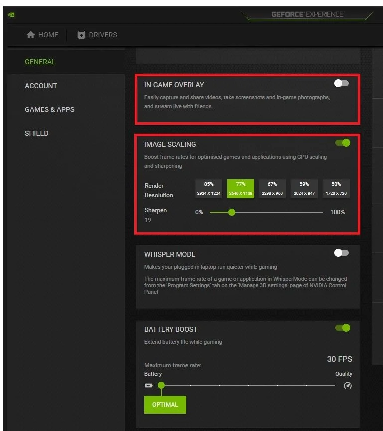 When navigating to your GeForce Settings, disable the In-Game Overlay in your General settings tab, as application overlays often cause performance issues. Below, you have the option to enable the Image Scaling option. For some, this option is unavailable as your graphics driver is not current. Enabling NVIDIA Image Scaling can dramatically increase your frame rate for any game you play on your PC.