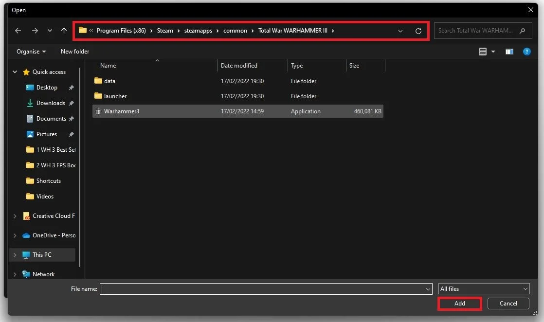 The file path for the Steam version is Program Files > Steam > steamapps > common > Total War Warhammer 3 and here select Warhammer 3.