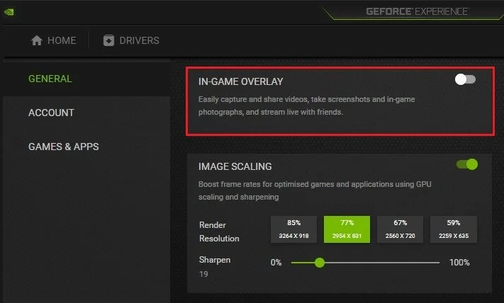 To further prevent startup issues with the game, navigate to your GeForce settings. In the General section, make sure to disable the In-Game Overlay.