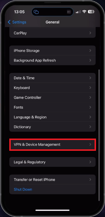 Stay in the 'General' settings of your iPhone and navigate to “VPN & Device Management”.