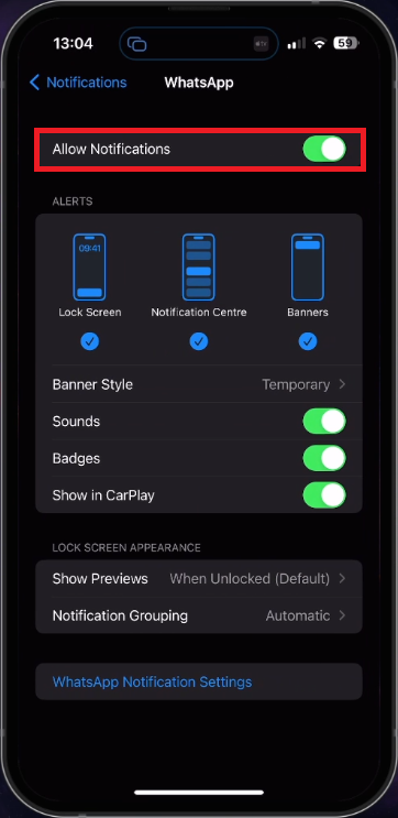 Ensure your iPhone's 'Allow Notifications' and 'Sounds' options for WhatsApp are toggled ON in the 'Notifications' section of iPhone settings.