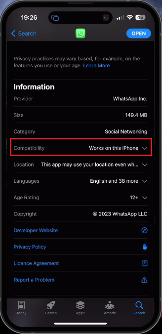 Scroll down to the "Compatibility" section on the WhatsApp page in your app store. Here, you'll find information about whether the app is compatible with your device.