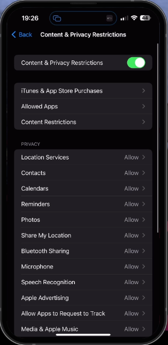 iPhone Settings > Screen Time > Content & Privacy Restrictions