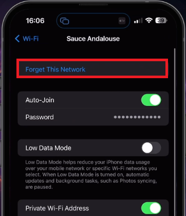 In your WiFi settings, tap the "i" icon next to the network you want to forget. Then, select 'Forget This Network'. Remember, you might need to enter your passcode to access this list of known networks.