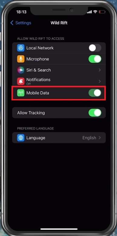 Scroll down to your Wild Rift settings and ensure the Mobile Data option is enabled.