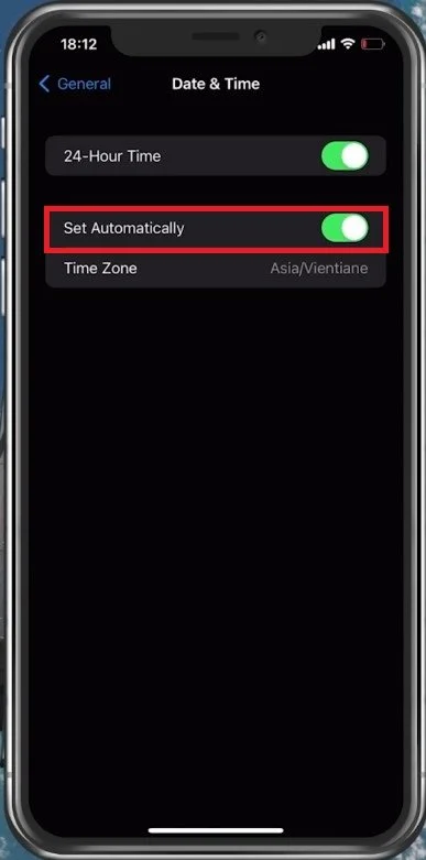 On iOS devices, tap on General and then on Date & Time. Ensure your device sets the time automatically, so simply enable the Set Automatically option.