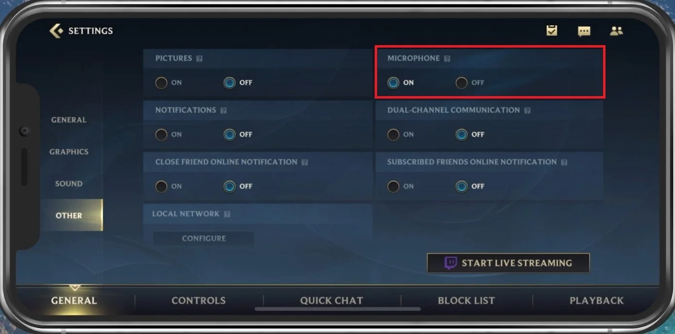 Under Other, set the Microphone setting to ON. After applying your changes, voice chat should work in Wild Rift. These settings also allow you to change the incoming voice chat volume.