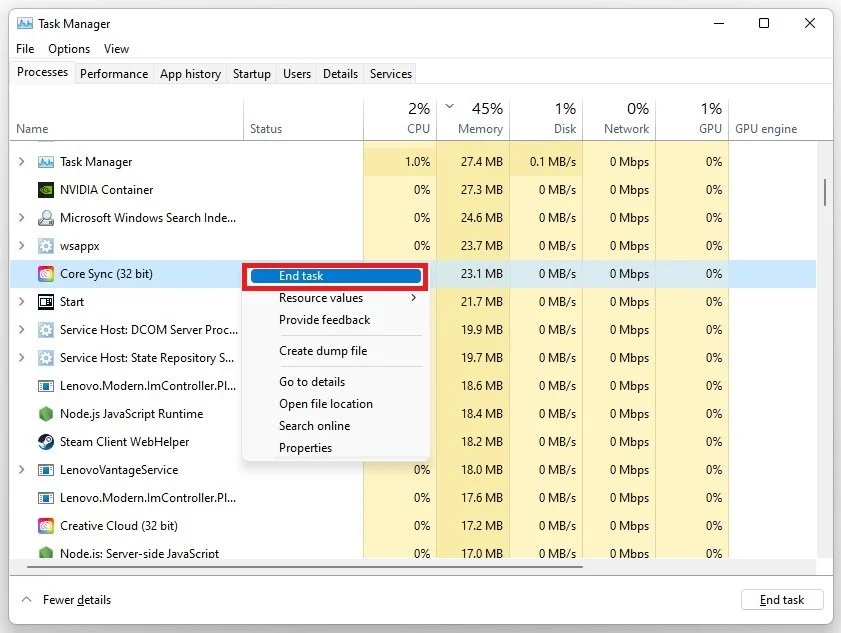 After optimizing your settings, open up your Task Manager by searching for it in your start menu search. In the Processes tab, make sure to end some processes from running in the background which are using up your CPU’s resources. This could be Adobe applications, Office 365 apps or other processes running in the background. Make sure not to end processes which you don’t know.