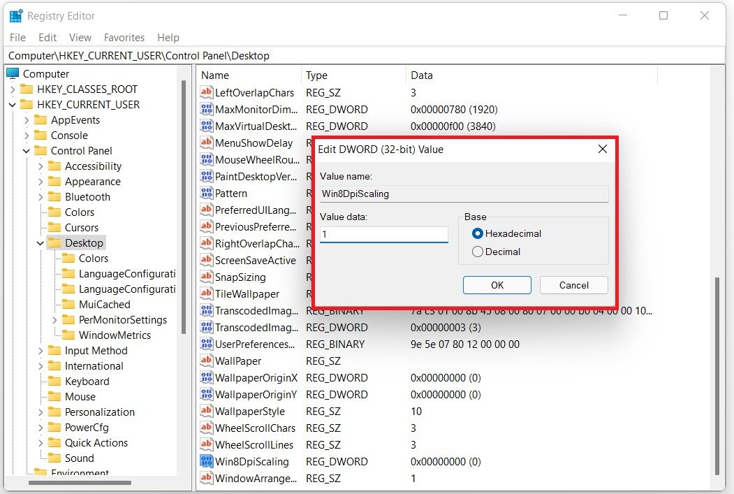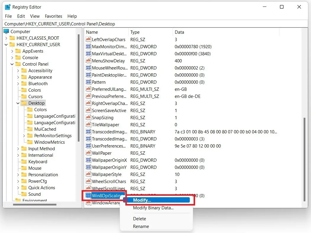 On the right hand side, select Win8DpiScaling on the bottom here, and go to Modify.