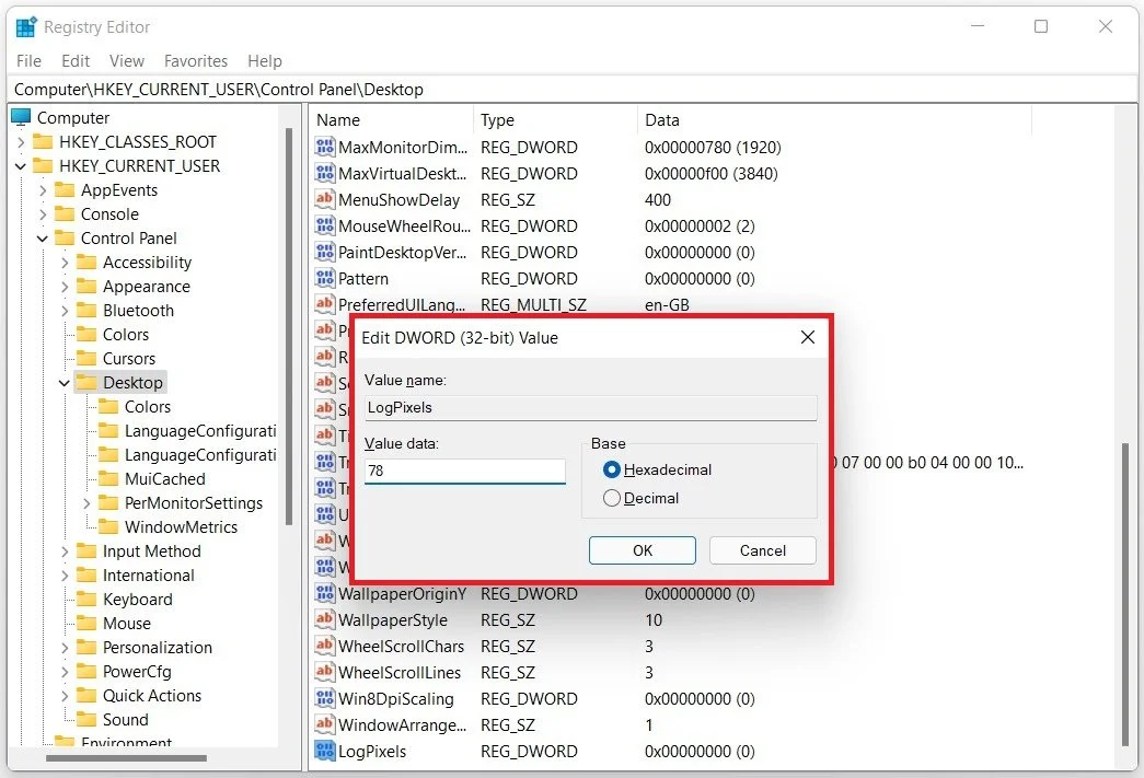 Ndame it LogPixels. Lastly, right-click the DWORD and set the value data to 78, and base to hexadecimal.