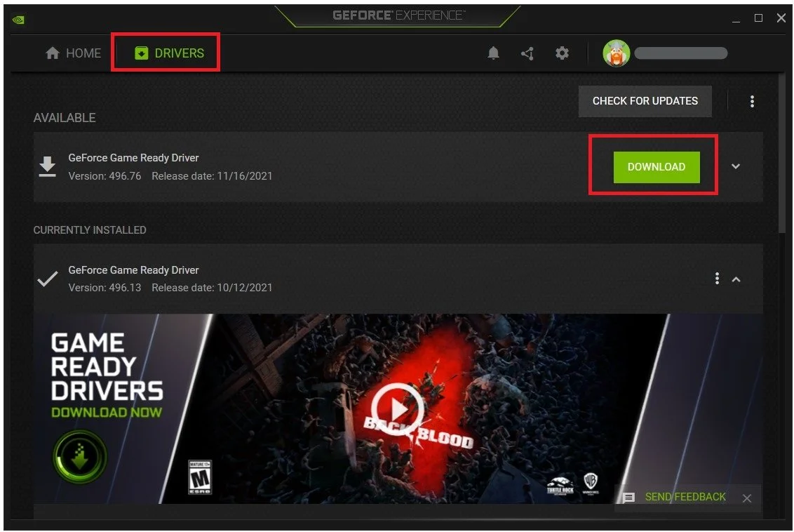 This will take a moment to ensure that your display driver is up to date. In case you are using multiple GPUs, ensure to repeat this step for each one of them. If you are using an NVIDIA graphics card, you can also use the GeForce Experience application. In the Drivers tab, select Download, and the application will automatically download and install the latest driver.