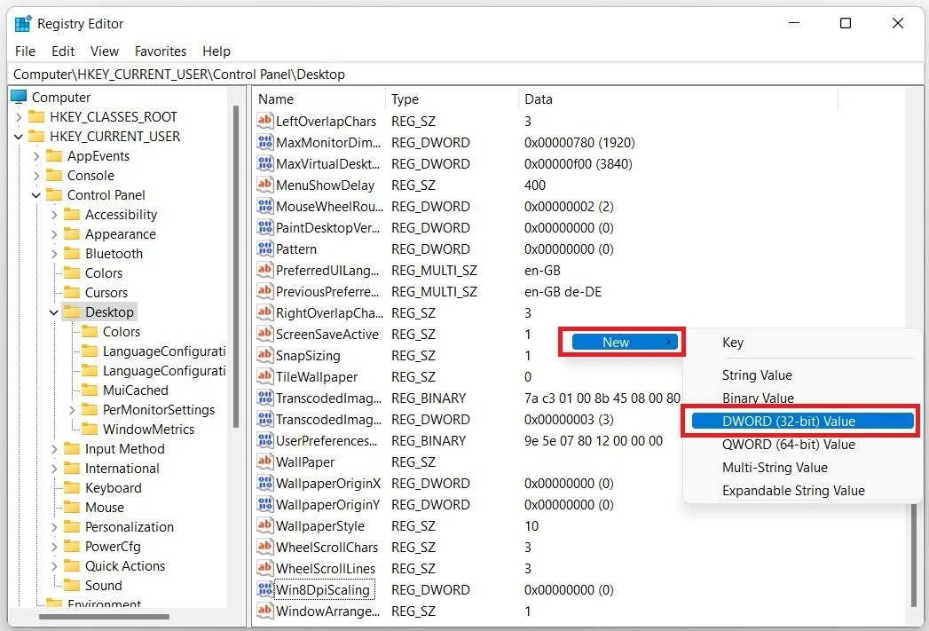 Control Panel > Desktop > New > DWORD 32 Bit Value