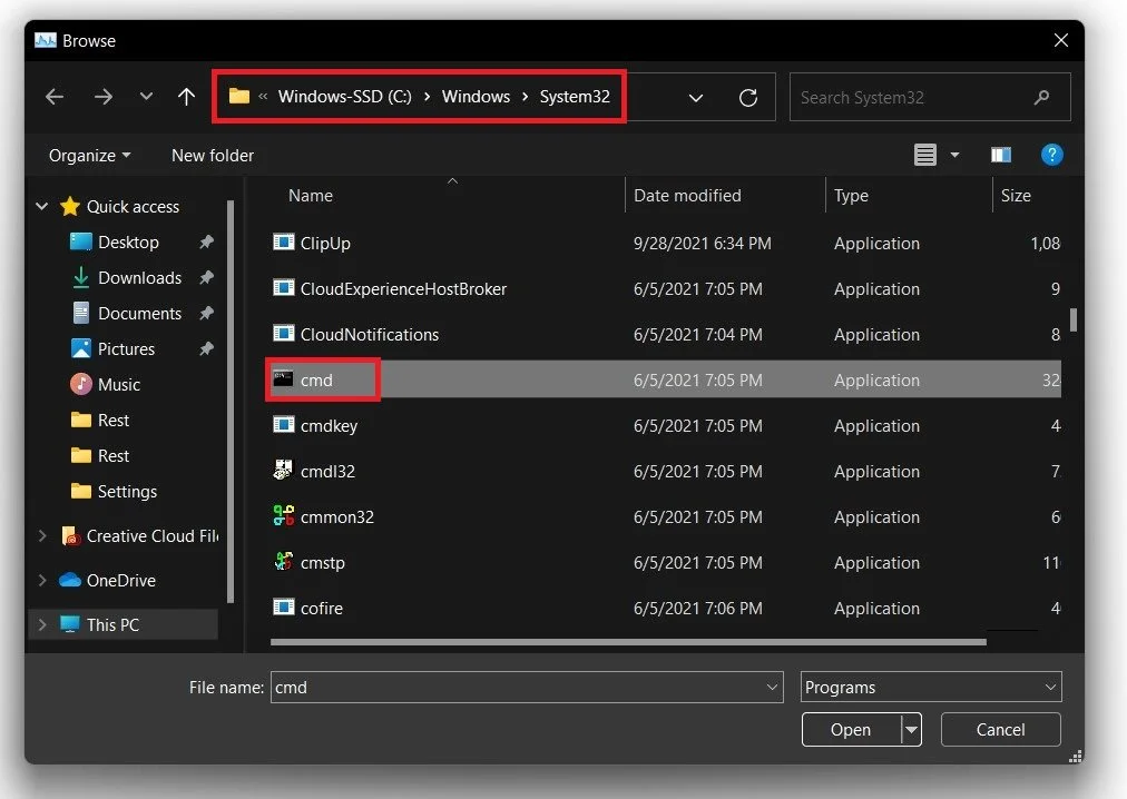 Navigate to your C: drive, Windows, System 32, and here find the Command Prompt application. Next, click on Open.