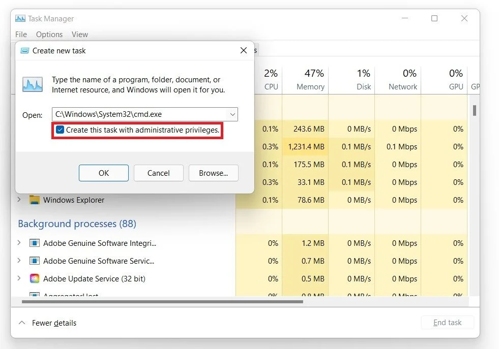 In your start menu search, type Task Manager. Right-click the icon and start it as an administrator. Select File and click on Run new task. Select Browse, and your file explorer will open up.