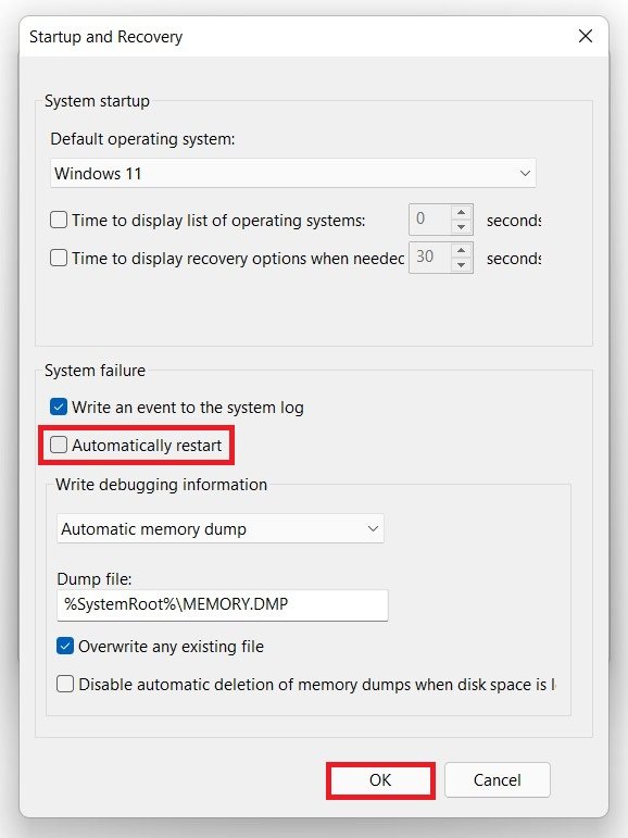 Ensure the Automatically restart on system failure is disabled. Press Ok.