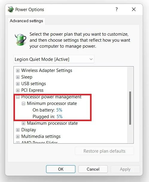 On the window, expand Processor power management and Minimum processor state. If the value is set to 100%, lower it to 5; if it’s not at 100, leave it as it is.